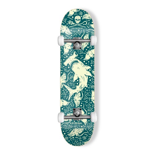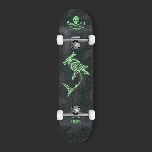 A foreboding collaboration with Sea Shepherd and Sunshine Coast Skateboard Company Eternal Skateboards – This decks bears a unique glow-in-the-dark Great White Shark Graphic.