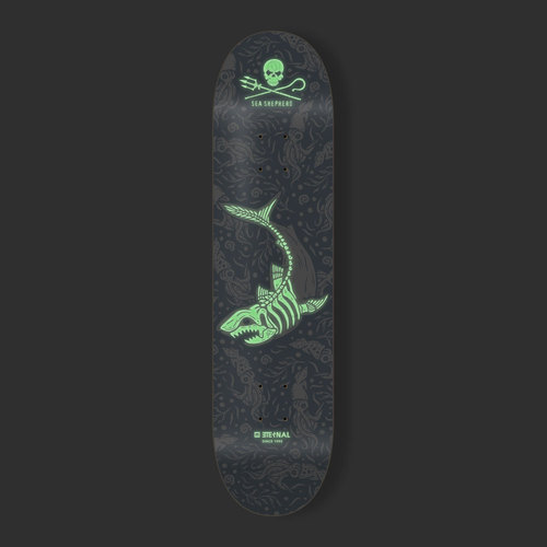 A foreboding collaboration with Sea Shepherd and Sunshine Coast Skateboard Company Eternal Skateboards – This decks bears a unique glow-in-the-dark Great White Shark Graphic.
