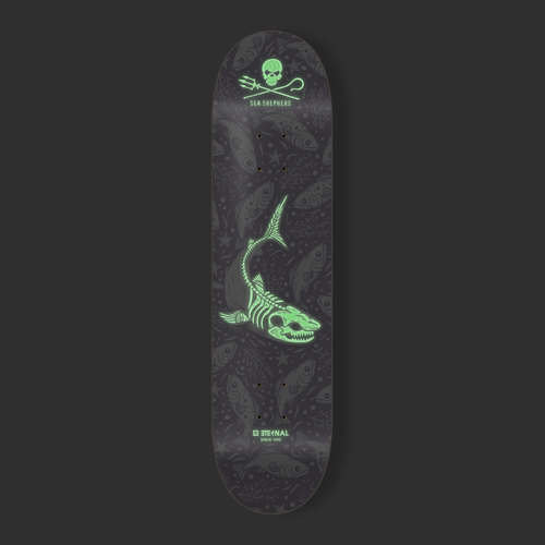 A foreboding collaboration with Sea Shepherd and Sunshine Coast Skateboard Company Eternal Skateboards – This decks bears a unique glow-in-the-dark Tiger Shark Graphic.